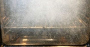 There’s a cloudy white haze trapped inside my oven door glass that won’t wipe off. What is it?